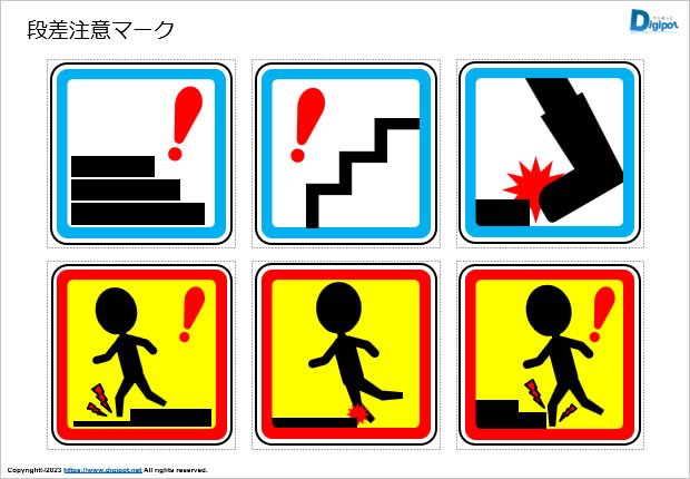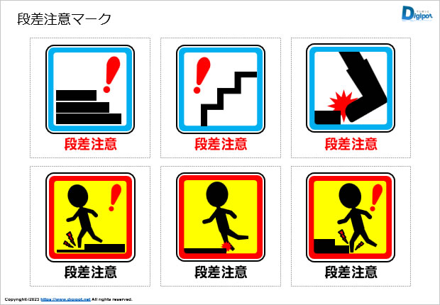 - 「段差注意」「足元の段差に気を付けて」「段差あります」「段差危険」などの貼り紙の素材に