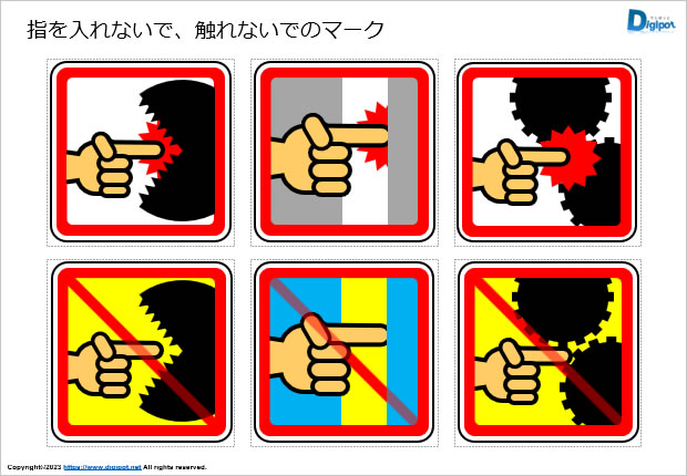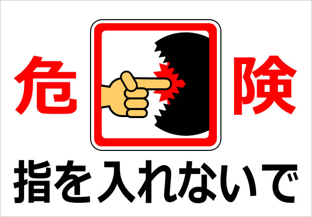 - 「指を挟まないように注意」「機械に指を近づけると危険です」「指を入れると噛まれます」などの貼り紙の素材に