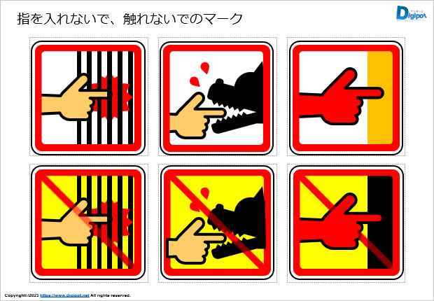 指を入れないで、触れないでのマーク、生き物に指、扉に指、ドアに指、機械に指、檻に指など12種類