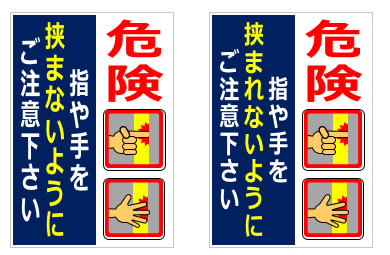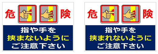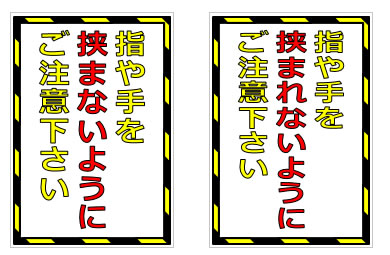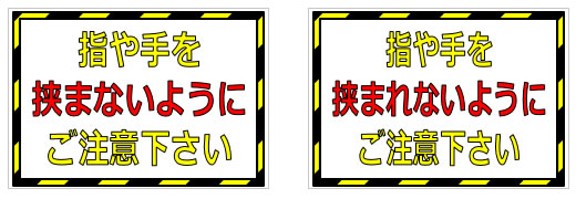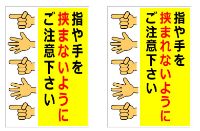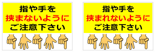 指や手を挟まないように注意を促す貼り紙です。「指や手を挟まないようにご注意下さい」と「指や手を挟まれないようにご注意下さい」の2パターンです。字面はほぼ同じ感じですが、挟ま(れ)ないようにと「れ」が入っています。こちらの方は機械など動いているものに対して注意を促している感じになりますね。