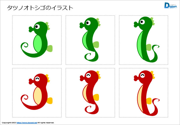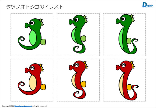 タツノオトシゴのイラスト、カラーバリエーション、各種ポーズ、フチ有フチ無しなど12種類