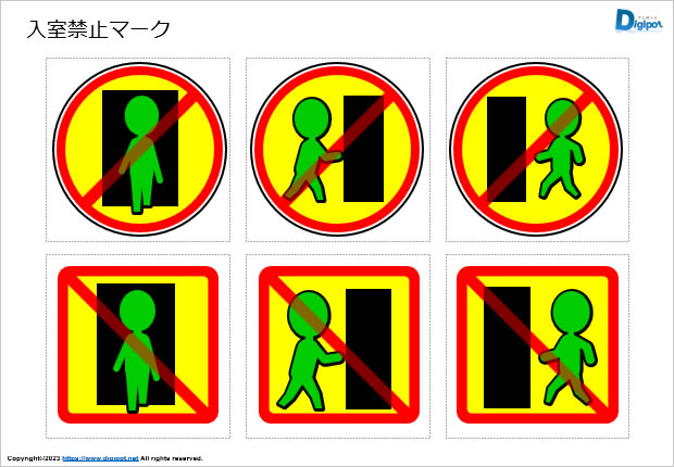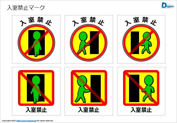 入室禁止マーク、各種パターン、文字入りなど12種類、パワポ版は貼り紙サンプル2点