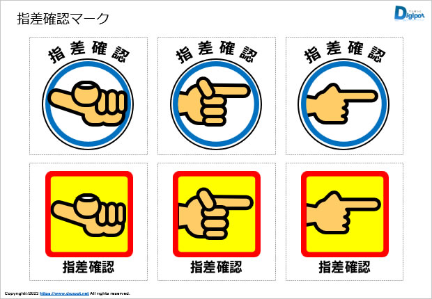 指差確認マーク、各種パターン、文字入りなど12種類、パワポ版は貼り紙サンプル2点