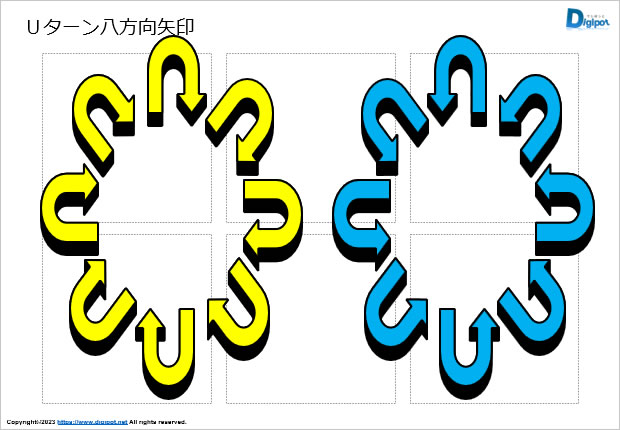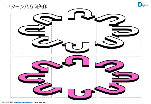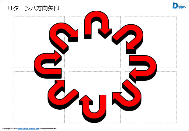 フリー、無料で使えるUターン八方向矢印画像です。パワーポイントPPTX形式、エクセルXLSX形式、ワードDOCX形式ファイルを用意しています。
