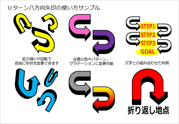 Uターン形状の各種八方向への矢印素材です。説明図などの素材にご活用ください。色の変更やサイズの変更など自由に行ってください。