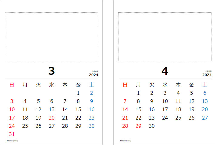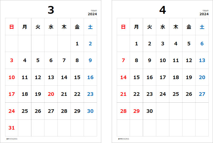 フリー、無料で使える一か月カレンダーテンプレート/2024年用(令和6年)です。パワーポイントPPTX形式と、エクセル版を用意しています。