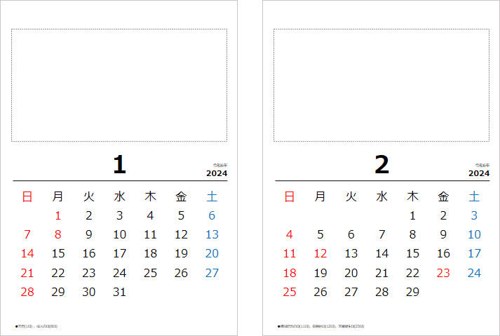 1ページに1か月の2024年用のカレンダーテンプレートです。予定を足したり画像を入れたりしてオリジナルカレンダー作成のテンプレートとしてご活用ください。