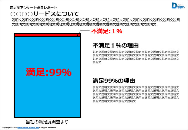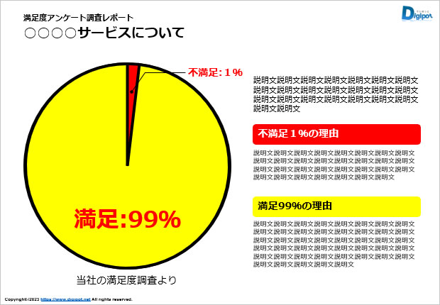 フリー、無料で使える満足度アンケート調査レポートのテンプレートです。パワーポイントPPTX形式で制作しています。