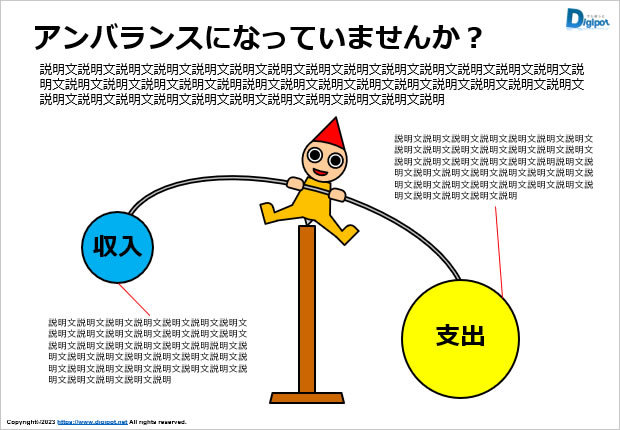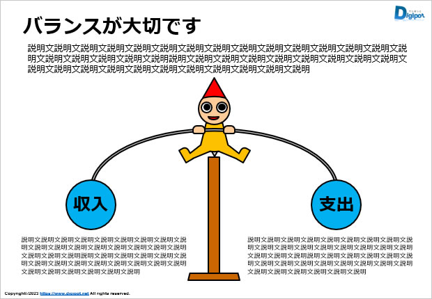 フリー、無料で使えるやじろべえを使った資料テンプレートです。パワーポイントPPTX形式で制作しています。