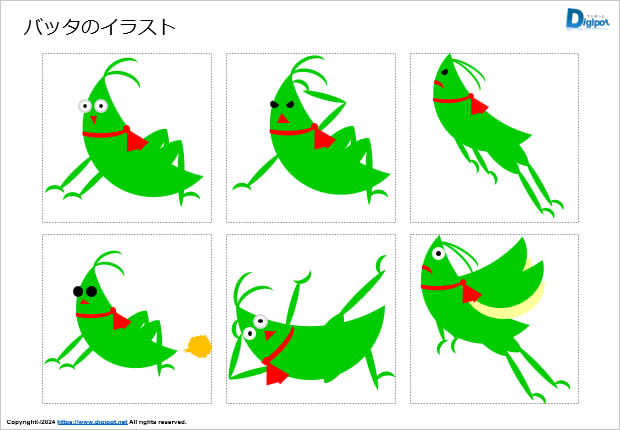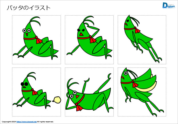 バッタ、昆虫、敬礼するバッタ、怠けるバッタ、飛ぶバッタ、おならをするバッタ、フチ無しフチ有など12種類