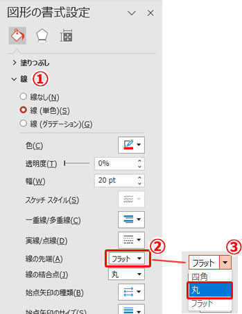 図の書式設定の(1)線の項目の、(2)線の先端のプルダウンメニューから、(3)丸を選択します。
