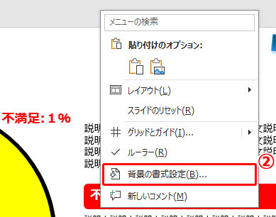 パワーポイントの資料を準備し、スライド上の空白スペース上で(1)右クリックし、メニューが開いたら(2)「背景の書式設定」をクリックします。