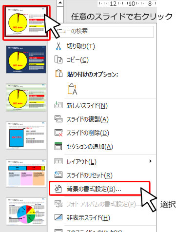 または、サムネイル上で右クリックしてメニューを出してから、「背景の書式設定」を選択しても同じです。