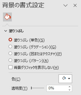背景の書式設定が開いたら、図形の塗りと同じ感じで任意に設定すれば完了です。