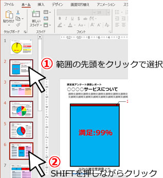 範囲選択する場合は、任意のスライドの先頭を選択してから、範囲の最後スライドに合わせてSHIFTを押しながらクリックします。