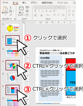 個別に選択する場合は、最初はクリックでスライドを選択、2つ目以降はCTRLを押しながらクリックします。
