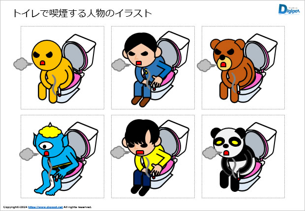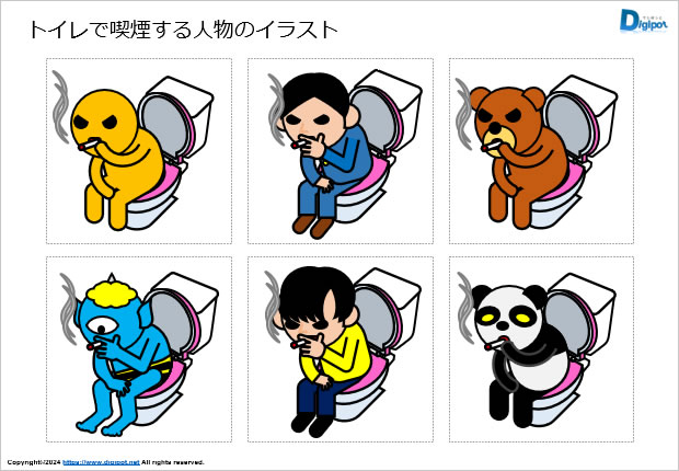 トイレで喫煙する、煙草を吸う人物のイラスト、喫煙クマ、喫煙パンダ、喫煙鬼など12種類