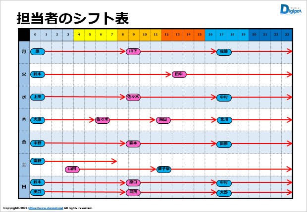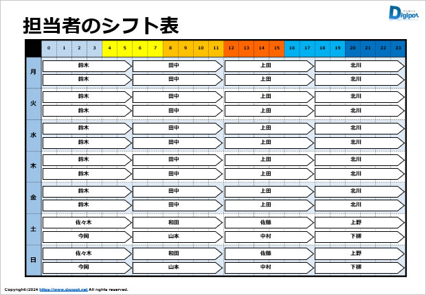 曜日、時間別のシフト表テンプレート、朝から夜、24時間タイプなど4種類