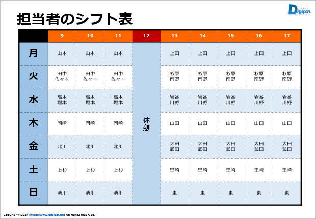 フリー、無料で使えるシフト表テンプレート/曜日、時間別です。パワーポイントPPTX形式、エクセルXLSX形式ファイルを用意しています。