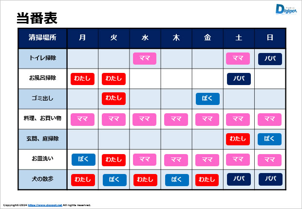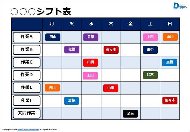フリー、無料で使えるシフト表テンプレート/曜日別です。パワーポイントPPTX形式、エクセルXLSX形式ファイルを用意しています。