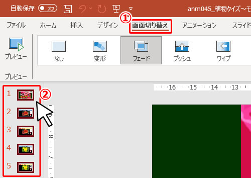 数の(1)「画面切り替え」タブをクリックし、(2)左側のスライドのサムネイルが表示されているエリアにターゲットしてから、全部(CTRL+A)または任意のスライドを選択します。