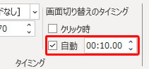 タイミングの項目の自動にチェックを入れ、任意の時間を調整します。