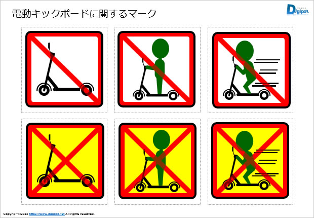 - 「電動キックボード禁止」「電動キックボード通行注意」などの貼り紙の素材に