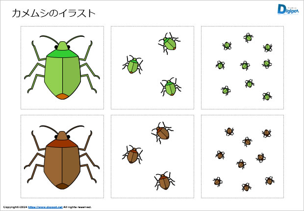フリー、無料で使えるカメムシのイラスト画像です。パワーポイントPPTX形式、PNG透明ファイル形式、エクセルXLSX形式、ワードDOCX形式ファイルを用意しています。