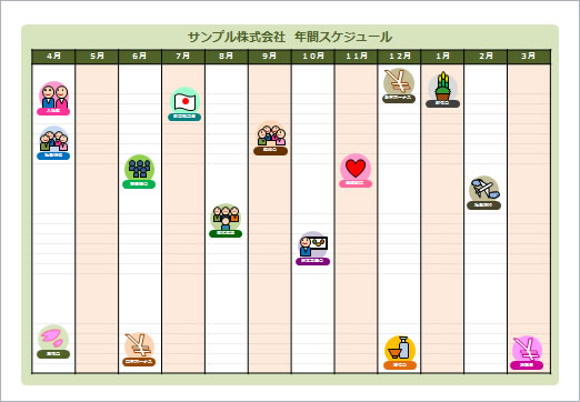 基本的にテーブルは、背景として利用します。その上にアイコンや文字、矢印などを載せて会社の年間スケジュールを作成してください。