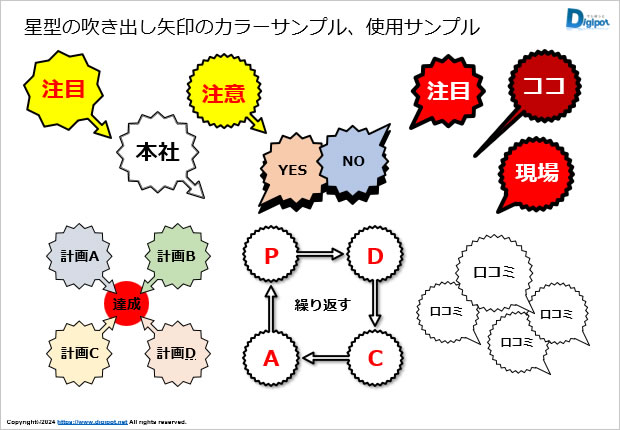 吹き出しのイラスト~星型の吹き出し矢印~(パワーポイント/PNG画像/エクセル/ワード)