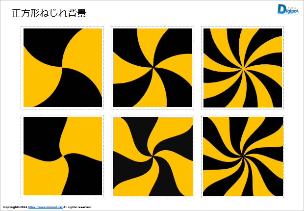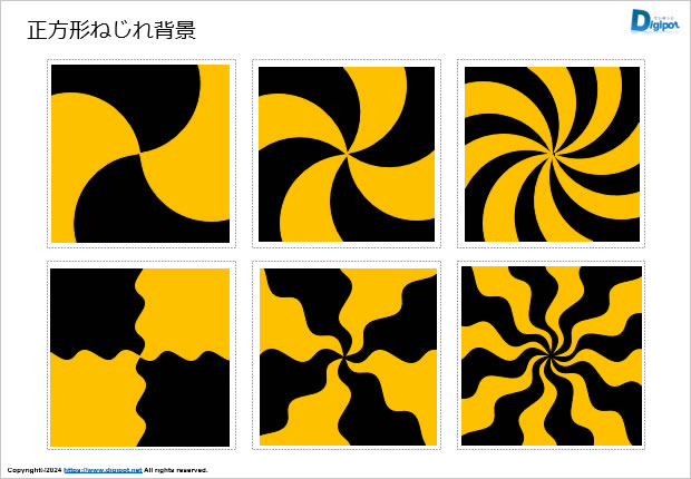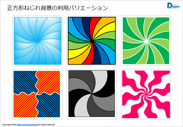 正方形ねじれ背景図形、各種ねじれタイプ、利用サンプルなど18パターン