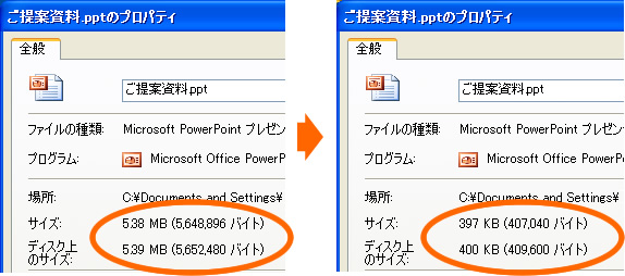 パワーポイント2007の場合は、そのままPDFに出力できます。PDFだと容量も軽いし、Adobe Readerで相手先にパワーポイントが無くても閲覧できます。当然編集もできませんが・・・