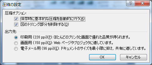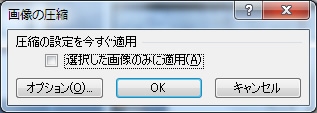 2パワーポイント2007も同じように画像を選択するとメニューが表示されますので、図の圧縮を選択します。2003では、96dpiか200dpiのどちらかでしたが、2007では、中間サイズも加わっております。