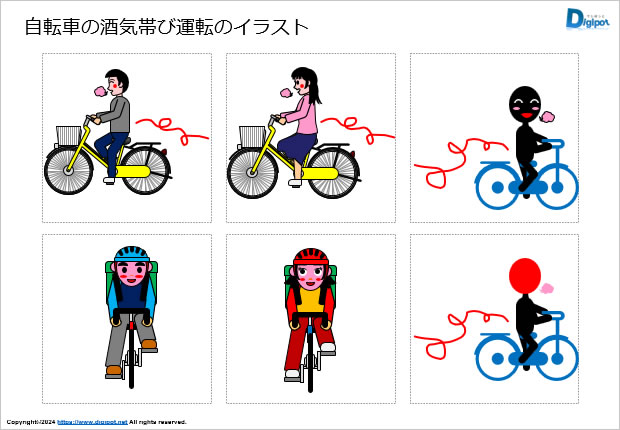 フリー、無料で使える自転車の酒気帯び運転のイラスト画像です。パワーポイントPPTX形式、PNG透明ファイル形式、エクセルXLSX形式、ワードDOCX形式ファイルを用意しています。