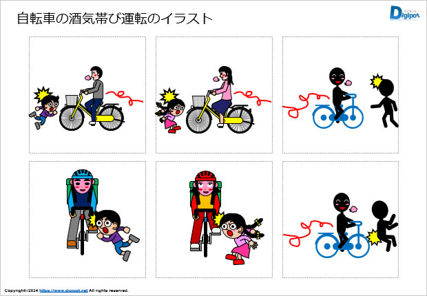 自転車の酒気帯び運転のイラスト、男性、女性、アイコン風、事故になりそうなイラストなど12種類