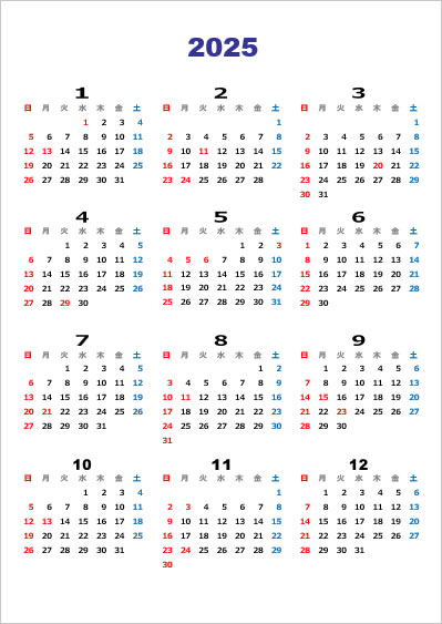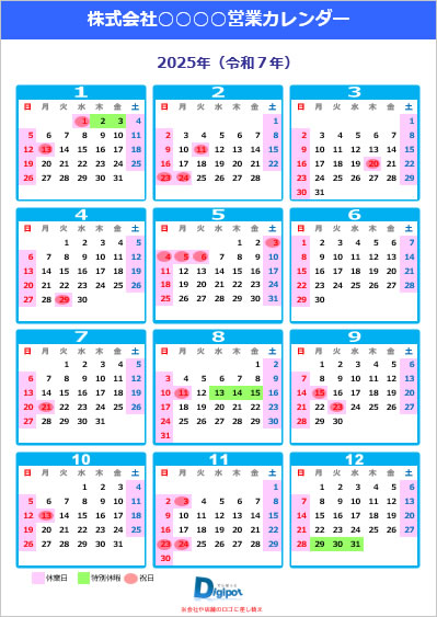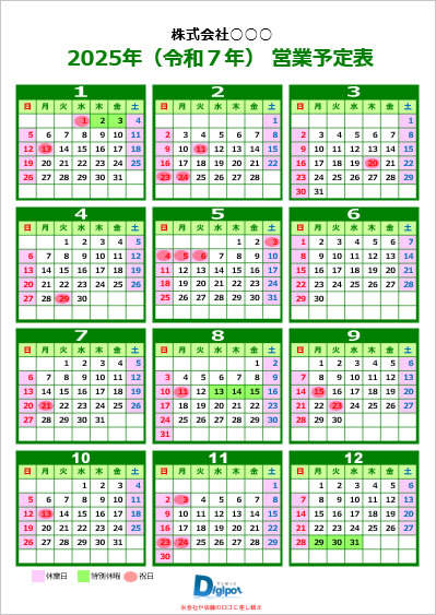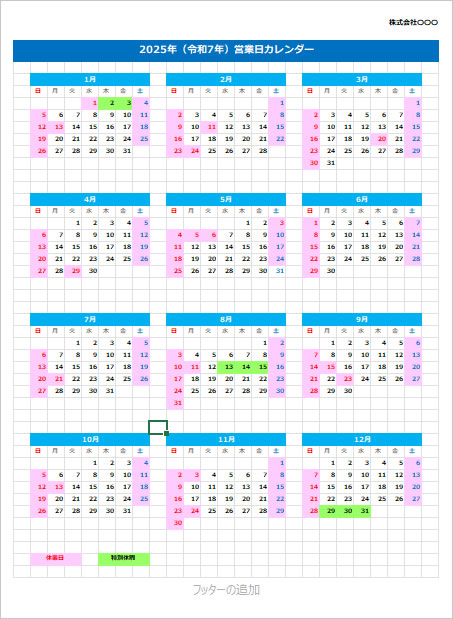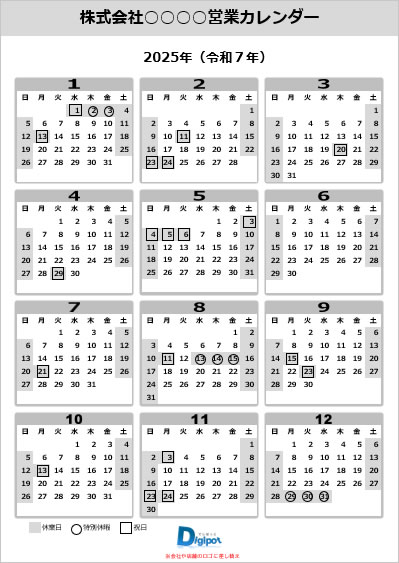 2025年用の営業日を案内するためのカレンダーテンプレートです。会社やお店の休業、休店日などを追記するなどしてご活用ください。