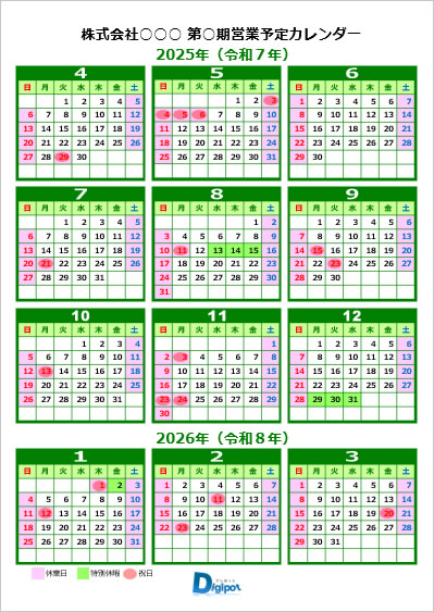 2025年4月~2026年3月用の営業日カレンダー、カラー、白黒など4種類。