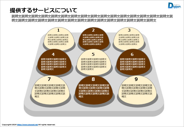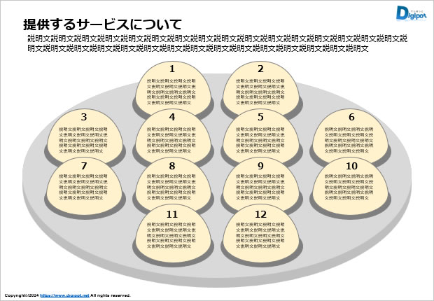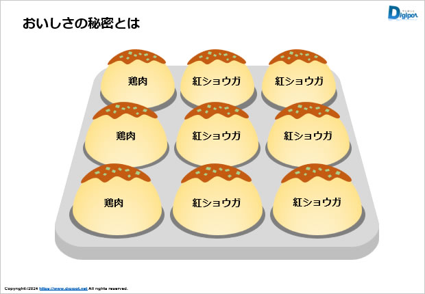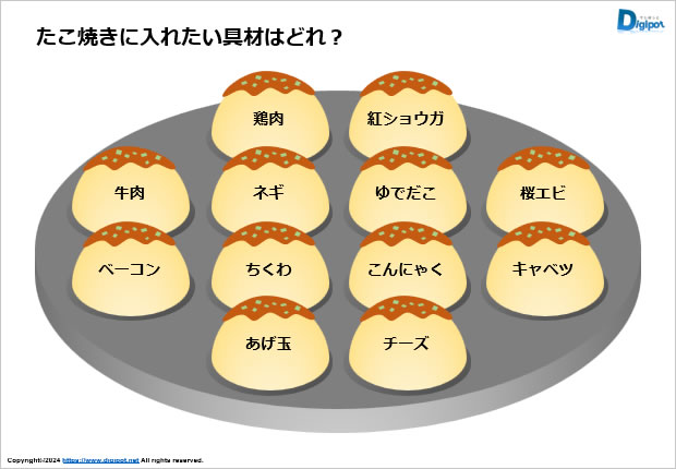 フリー、無料で使えるたこ焼きプレート風の説明図作成テンプレートです。パワーポイントPPTX形式で制作しています。