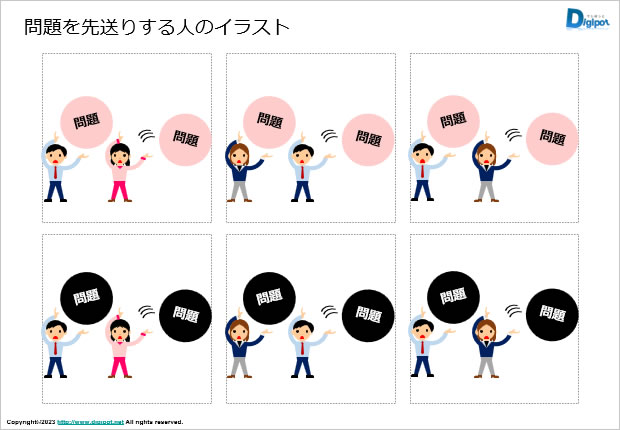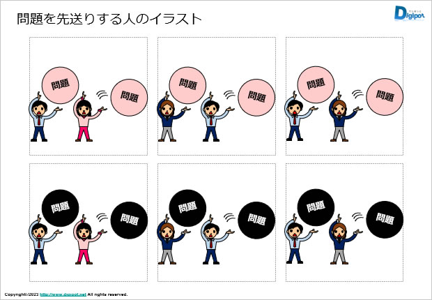 問題を先送りする人のイラスト、問題を左から右に先送りするビジネスマンやビジネスウーマン、フチ有りフチ無しなど12種類