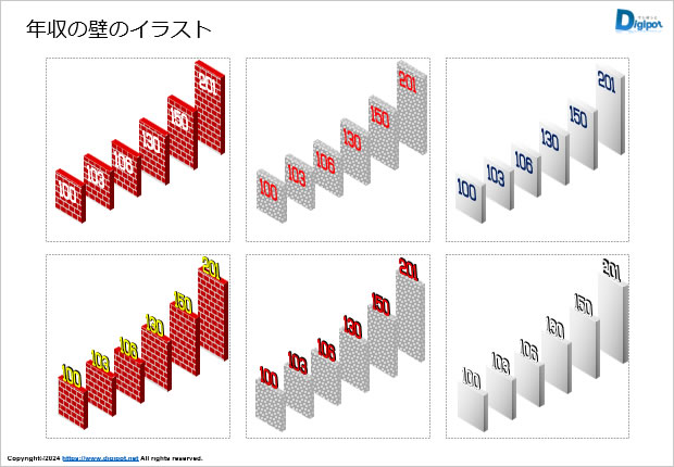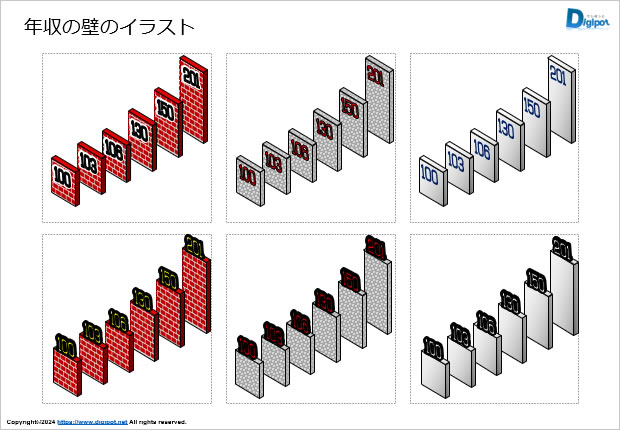 年収の壁のイラスト、100万円の壁、103万円の壁、106万円の壁、130万円の壁、150万円の壁、201万円の壁、フチ有りフチ無しなど12種類