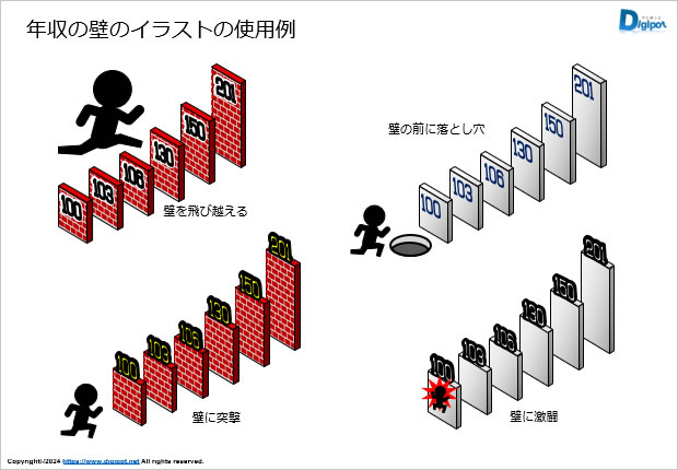 フリー、無料で使える年収の壁のイラスト画像です。パワーポイントPPTX形式、PNG透明ファイル形式、エクセルXLSX形式、ワードDOCX形式ファイルを用意しています。