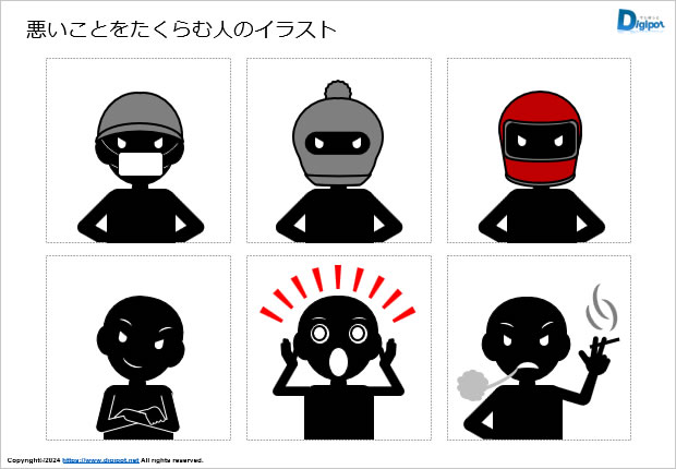 悪いことをたくらむ人のイラスト、お金を数える、ヘルメット、マスク、悪いことを考えるなど12種類
