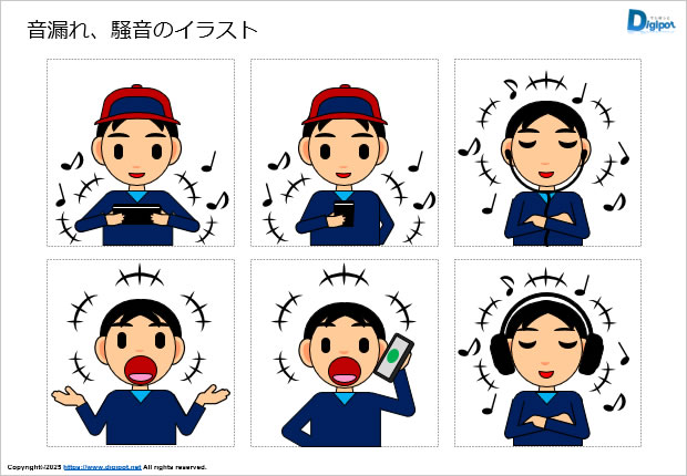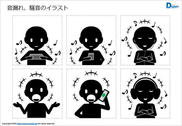 音漏れ、騒音のイラスト、ゲームの音漏れ、イヤホンから音漏れ、ヘッドホンから音漏れ、大声、大声通話など12種類
