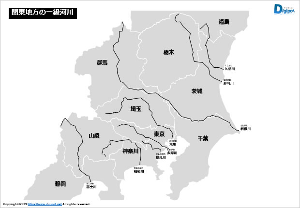 関東地方の一級河川、久慈川、那珂川、利根川、東京都、荒川、多摩川、鶴見川、相模川、富士川の位置、カラー、白黒など