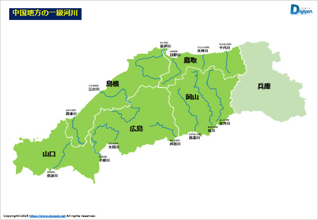フリー、無料で使える中国地方の一級河川です。パワーポイントPPTX形式で制作しています。