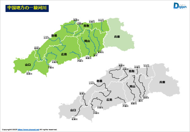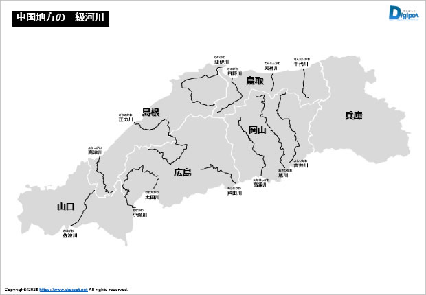 中国地方の一級河川、千代川、天神川、日野川、斐伊川、江の川、高津川、吉井川、旭川、高梁川、芦田川、太田川、小瀬川、佐波川の位置、カラー、白黒など