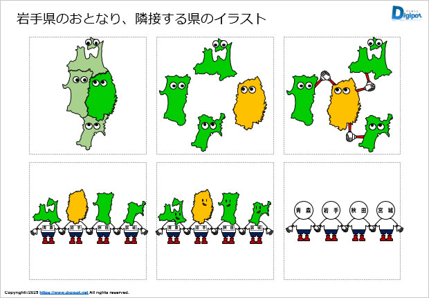 岩手県のおとなり、隣接する県のイラスト、周辺都道府県、キャラクター風、岩手県と手をつなぐなど12種類