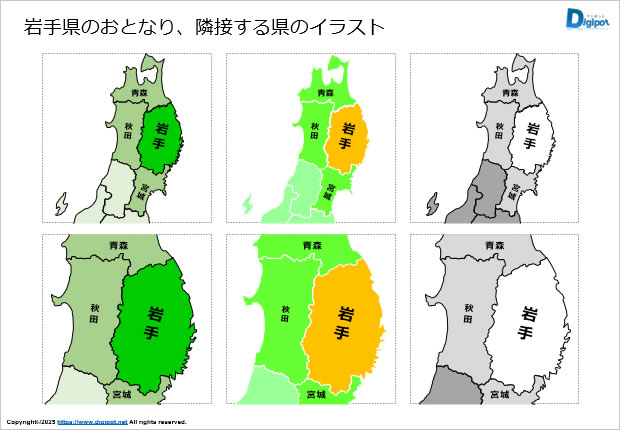 フリー、無料で使える岩手県のおとなり、隣接する県のイラスト画像です。パワーポイントPPTX形式、PNG透明ファイル形式を用意しています。