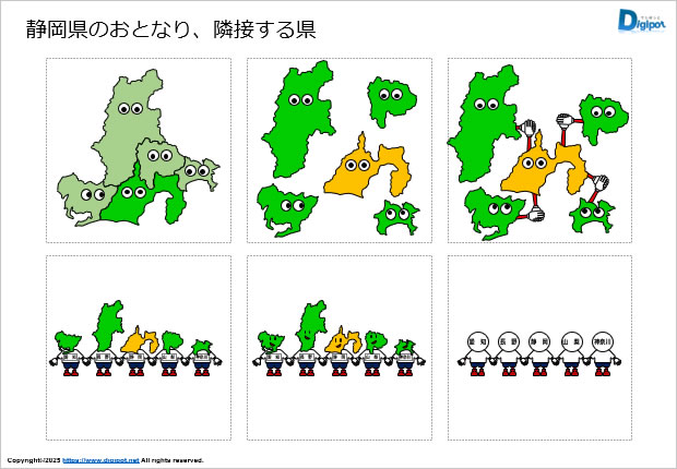 静岡県のおとなり、隣接する県のイラスト、周辺都道府県、キャラクター風、静岡県と手をつなぐなど12種類