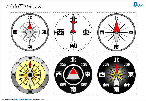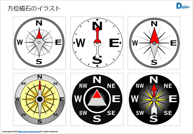 方位磁石のイラスト、東西南北、EWSN、八方向など12種類